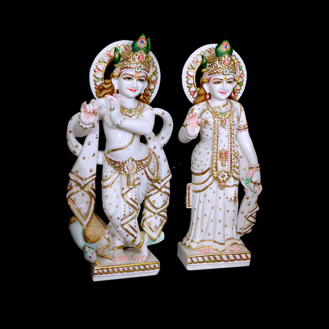 This realistic statue of Radha and Kanha, crafted from pure Vietnam marble, The murti captures the divine beauty with its sleek details and smooth finish. Adorned with delicate craftsmanship, the mesmerizing gaze of Radha and Krishna emanates a hypnotic charm. This exquisite sculpture symbolizes eternal love and devotion and captures divine grace and spiritual bliss.