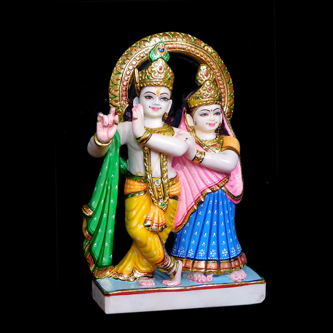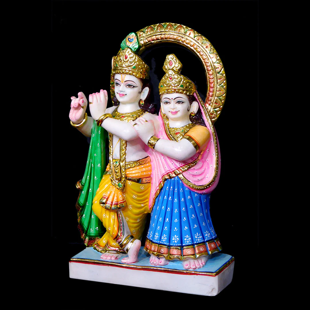 This lifelike Radha Krishna statue, carved from premium Makrana White Marble, beautifully embodies their divine love and grace. The smooth finish and intricate detailing highlight the elegance of the sculpture, while the delicately crafted peacock feather (mor pankh) adds a magical charm. Invite serenity and devotion into your space with this exquisite work of spiritual artistry.