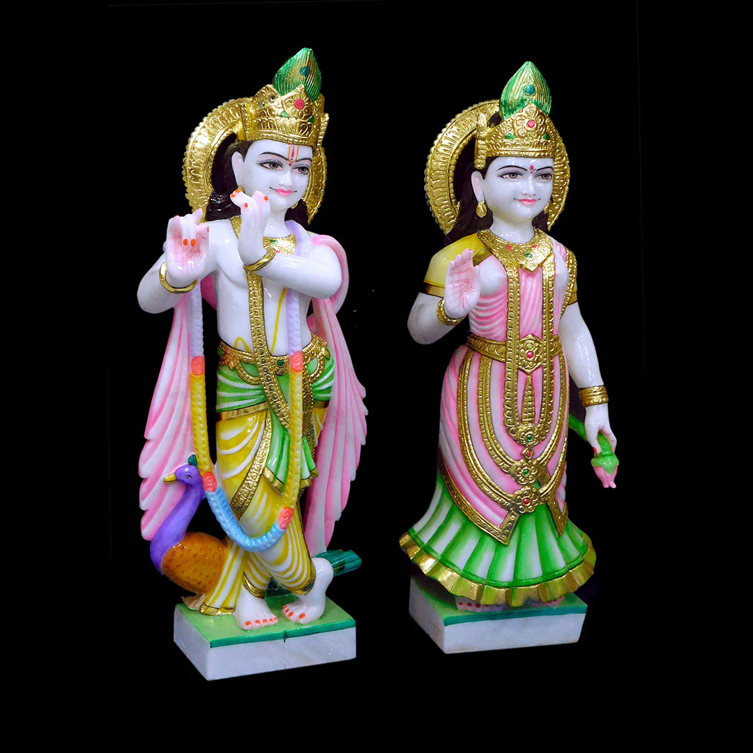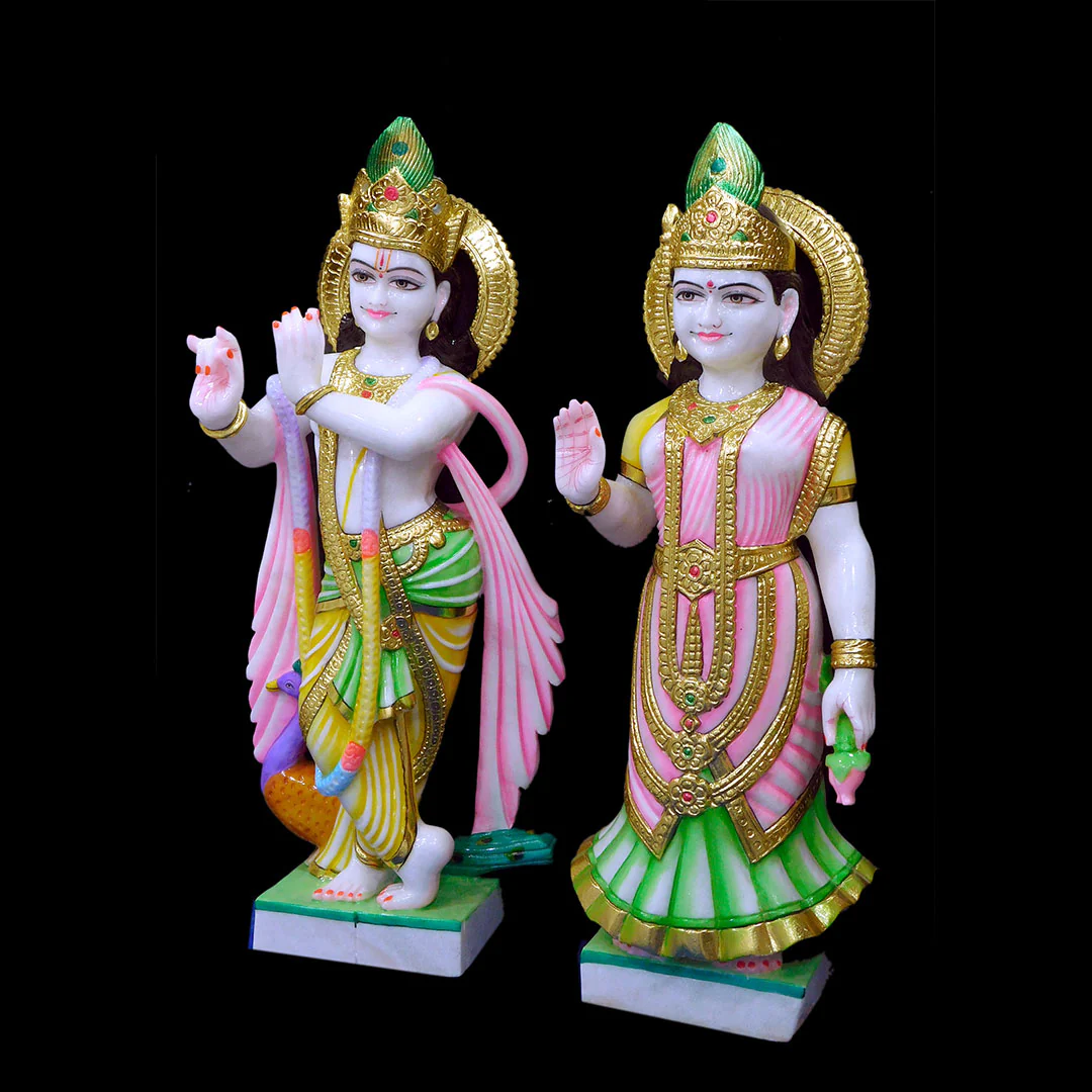 Crafted from pristine Makrana marble, this lifelike Radha Krishna statue radiates divine love and serene beauty. The smooth finish and intricate color detailing elevate its charm, while the delicately sculpted peacock feather (mor pankh) adds a magical touch. The vibrant hues breathe life into the murti, making it a captivating blend of artistry and spirituality. Invite the sacred presence of Radha Krishna into your space with this exquisite symbol of devotion and grace.