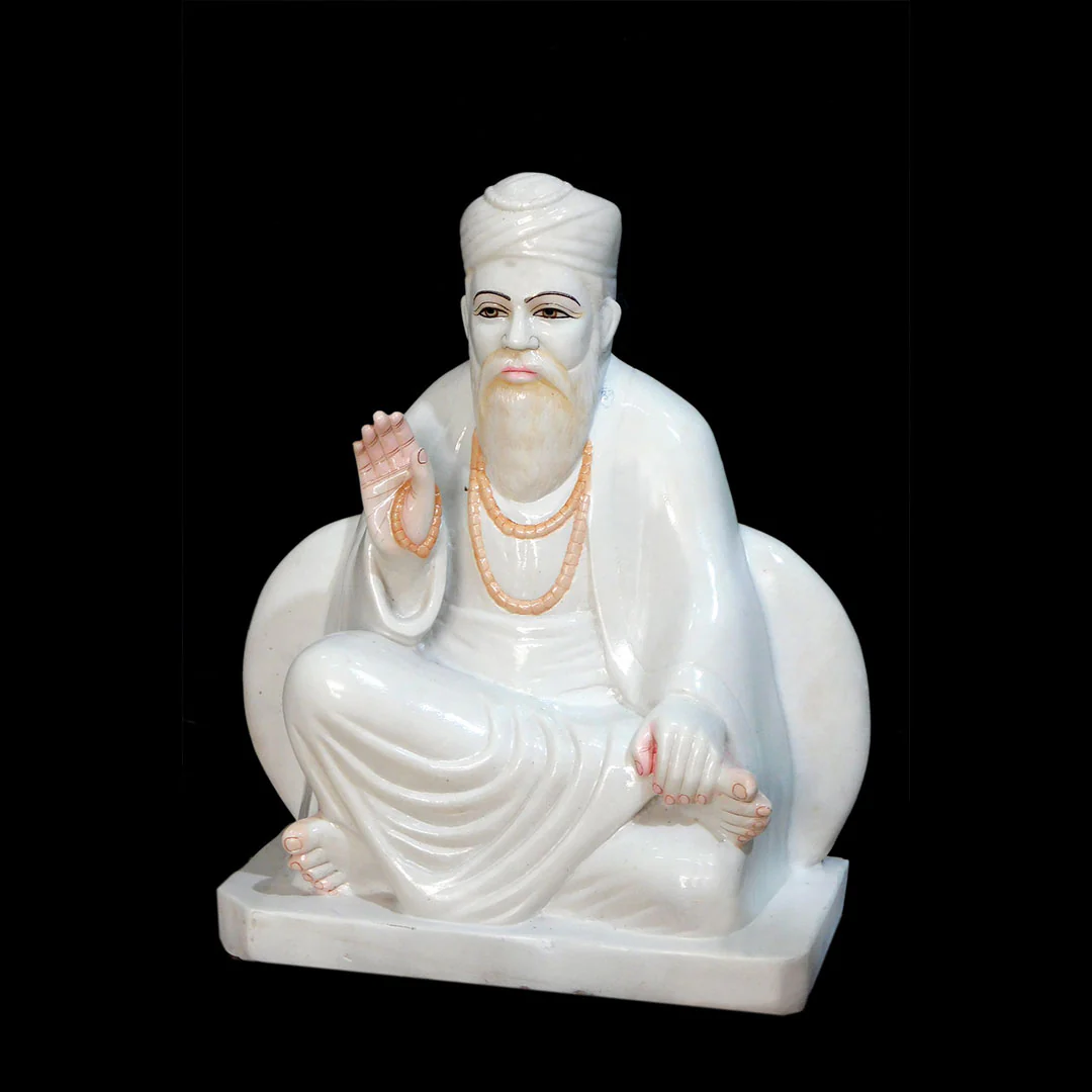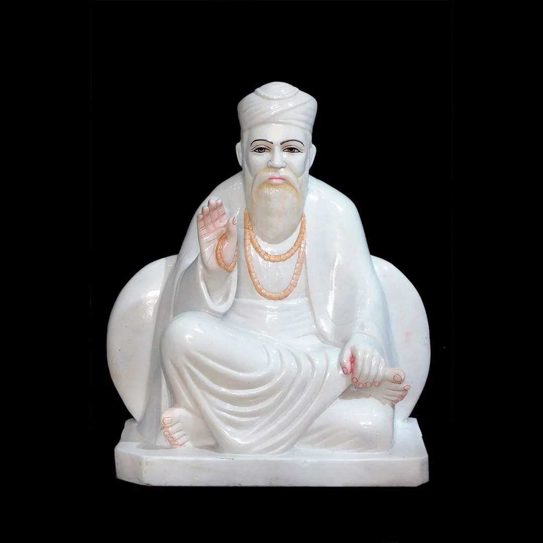 Discover the divine presence of Guru Nanak Dev Ji with this beautifully handcrafted statue, made from pure Makrana white marble. Every intricate detail is skillfully sculpted by our expert artisans, giving the idol a lifelike and captivating appearance. Bring home this remarkable masterpiece to invite peace, grace, and the blessings of Guru Nanak into your space.
