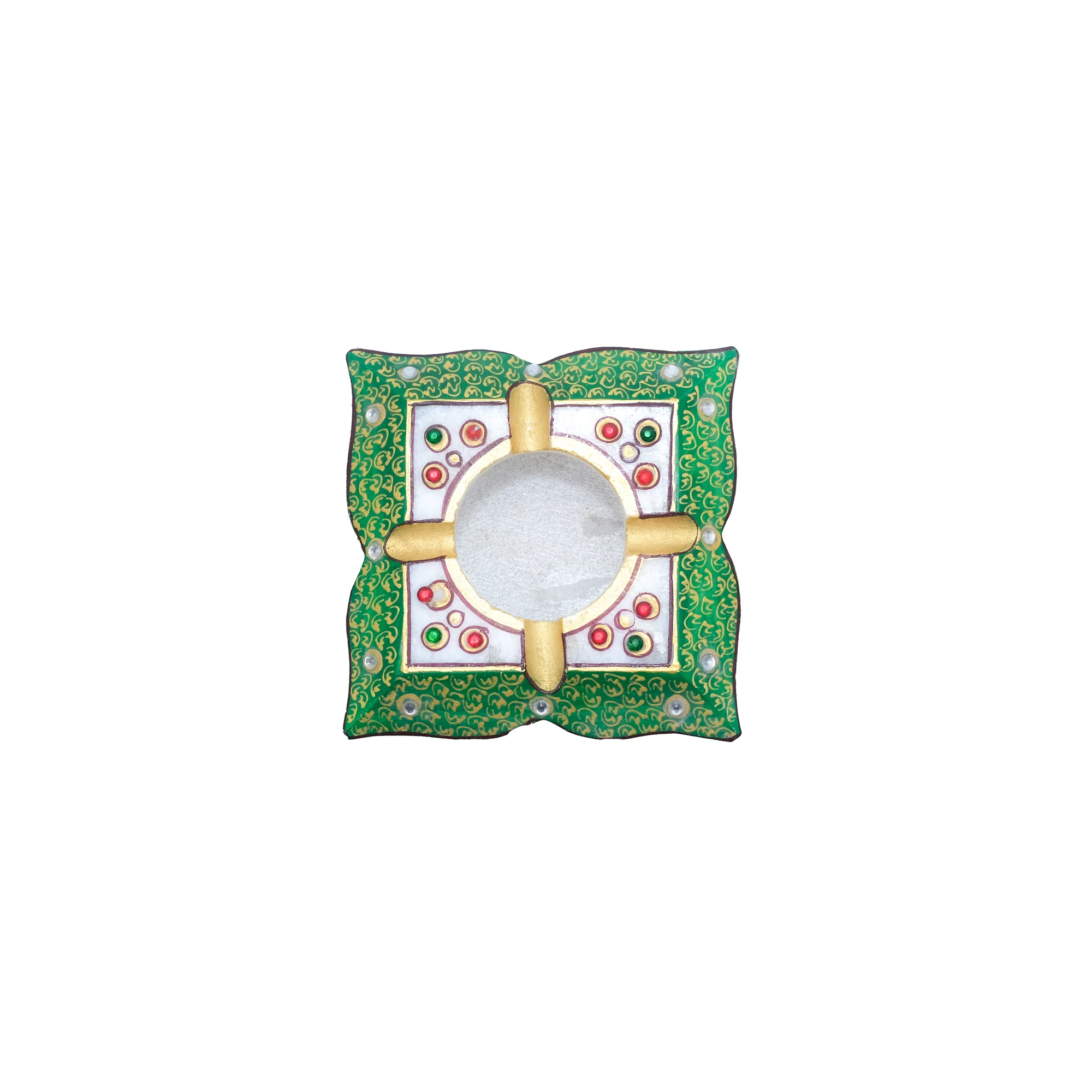 No pooja space is complete without an agarbatti stand. This beautifully crafted piece is made entirely from marble, hand-painted in vibrant red and green hues, and elegantly adorned with sparkling Kundan stones.