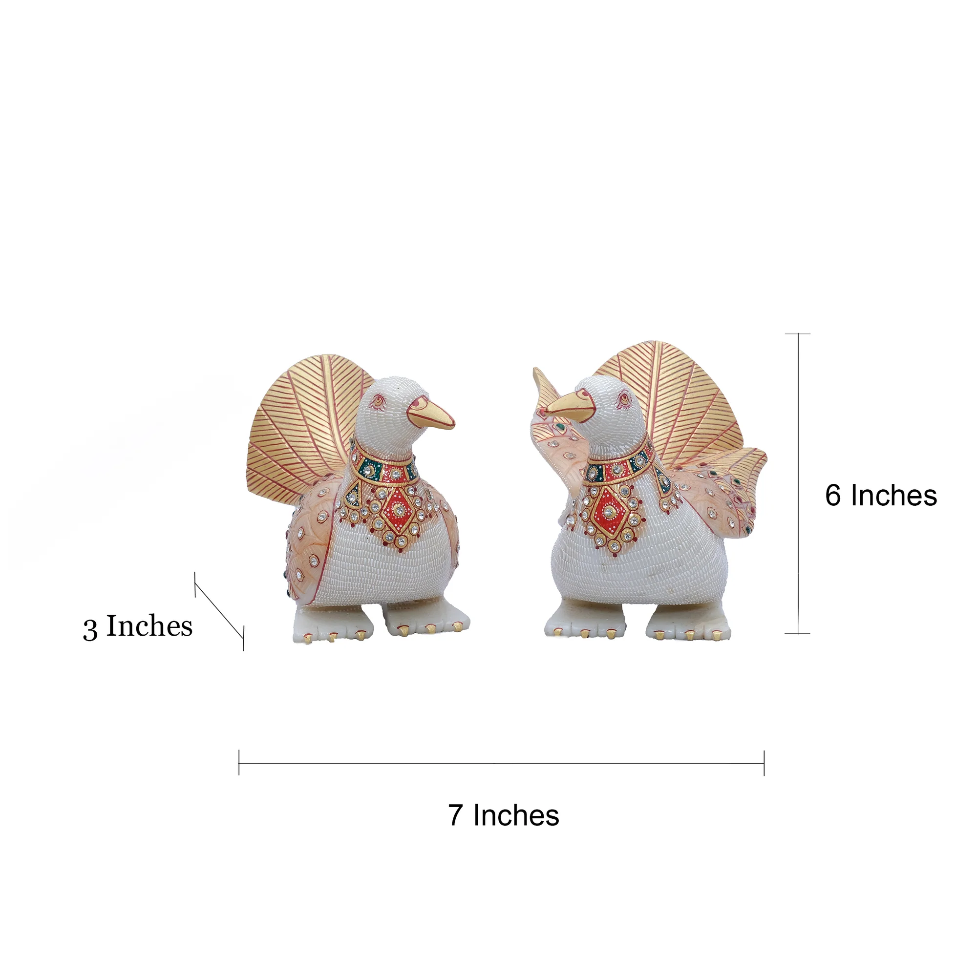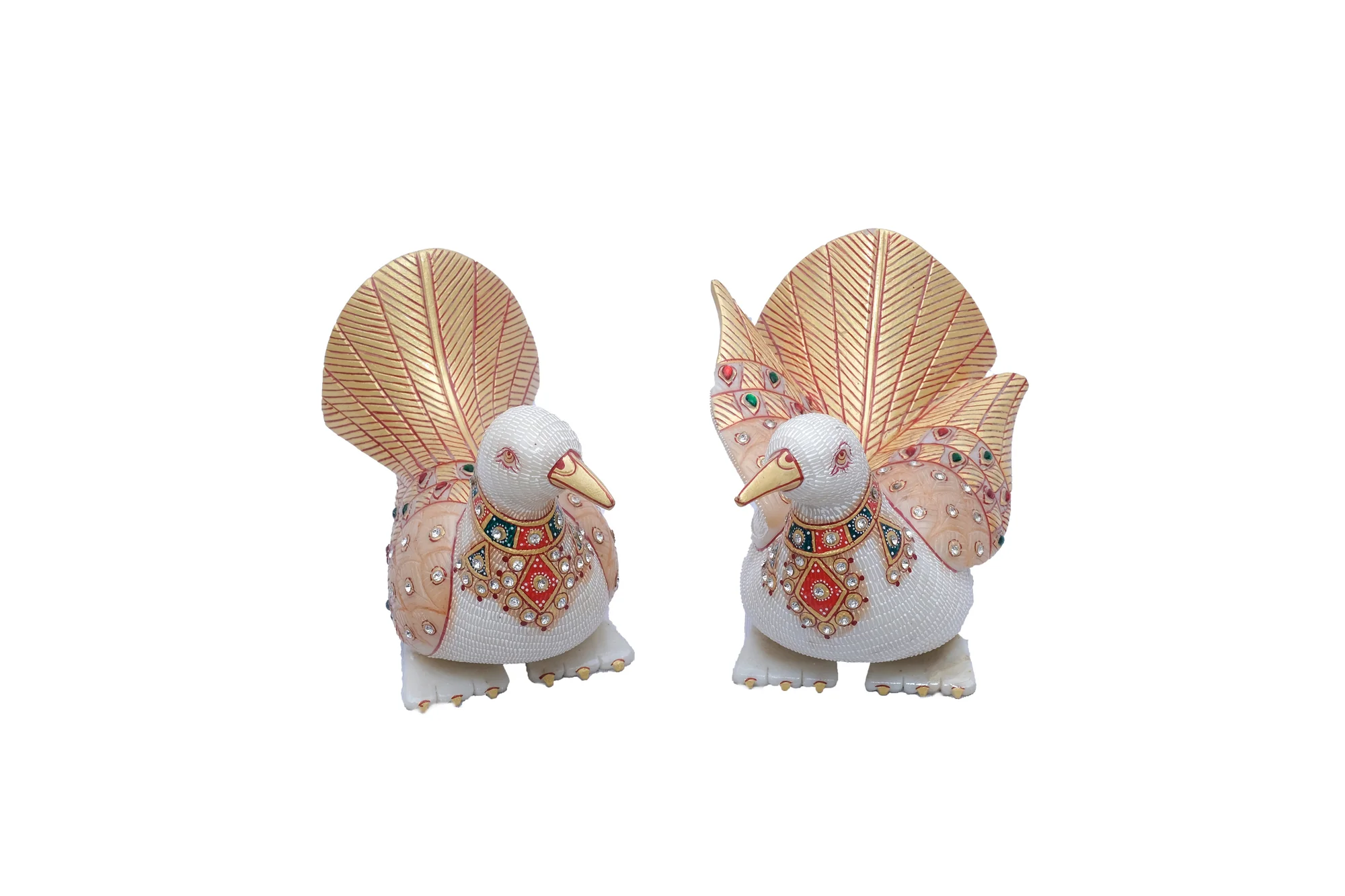 This exquisite pair of marble pigeons is handcrafted from Rajasthan’s finest white Makrana marble. Their beaks and feathers are delicately painted in gold, while their necks feature intricate Minakari-style detailing in rich hues of gold, red, and green, accented with sparkling stone inlays.