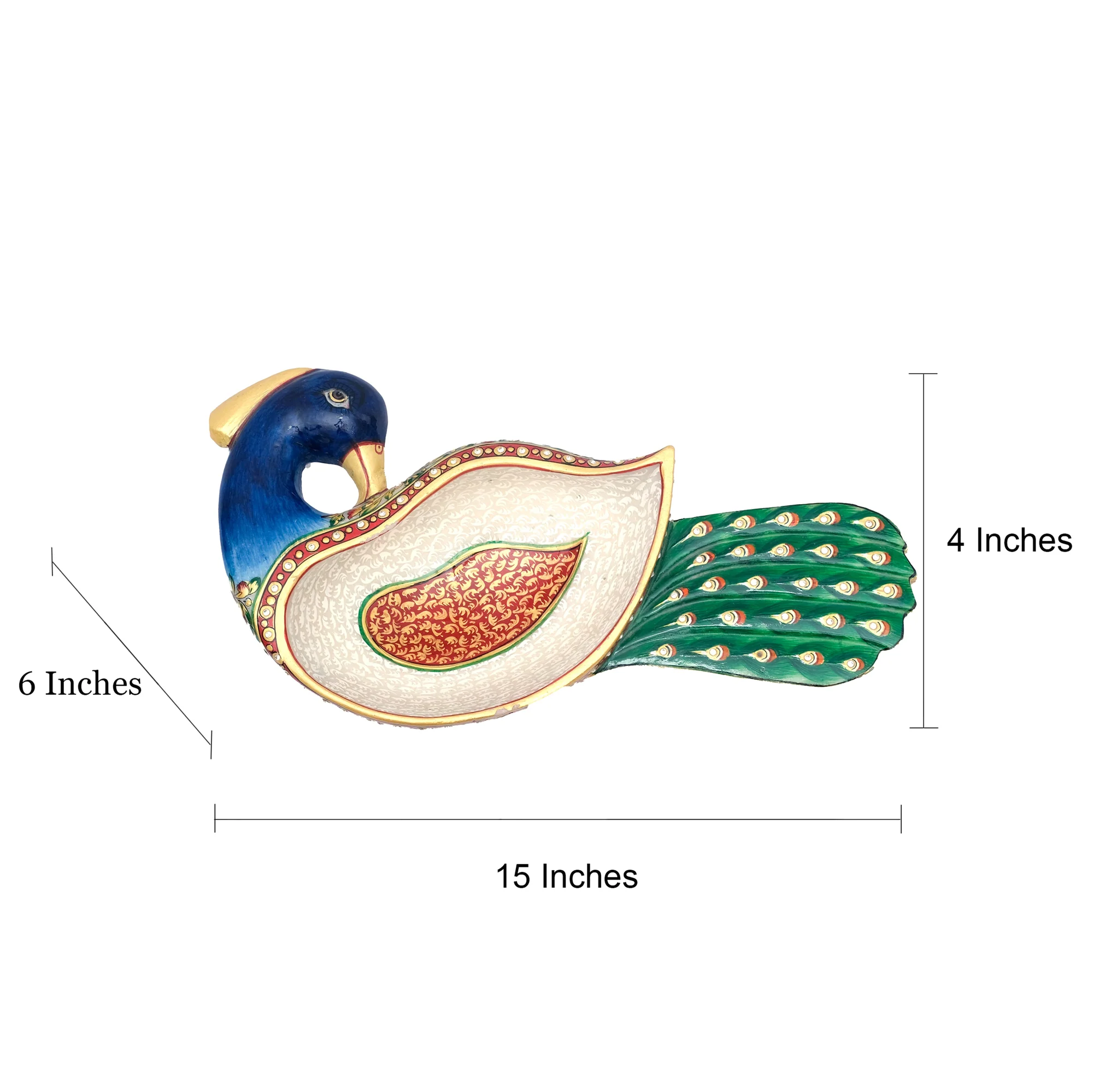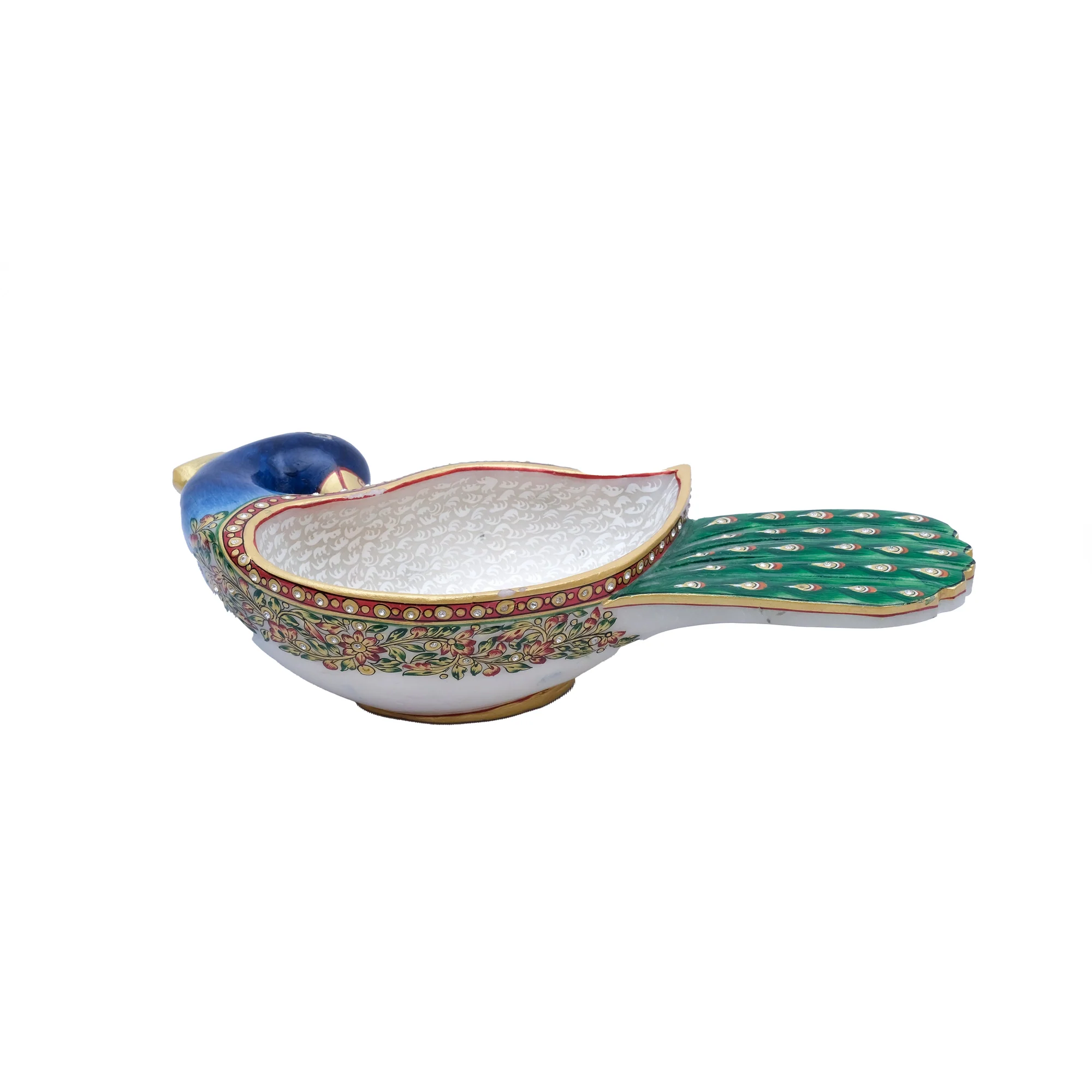 Expertly carved from pure white marble, this peacock-shaped bowl captures the graceful beauty of the bird itself. Handpainted in authentic peacock hues and embellished with sparkling Kundan stones, it radiates a majestic and royal charm, making it a striking addition to your home décor.