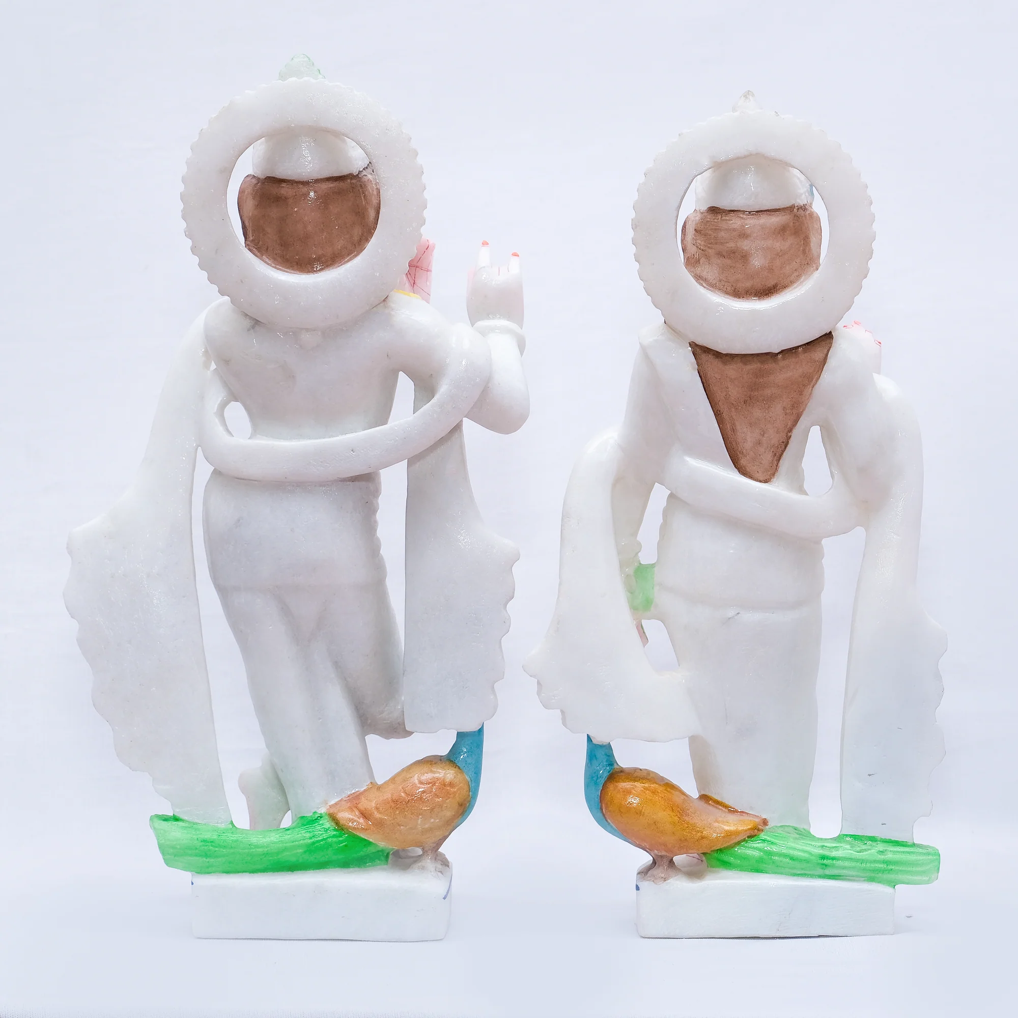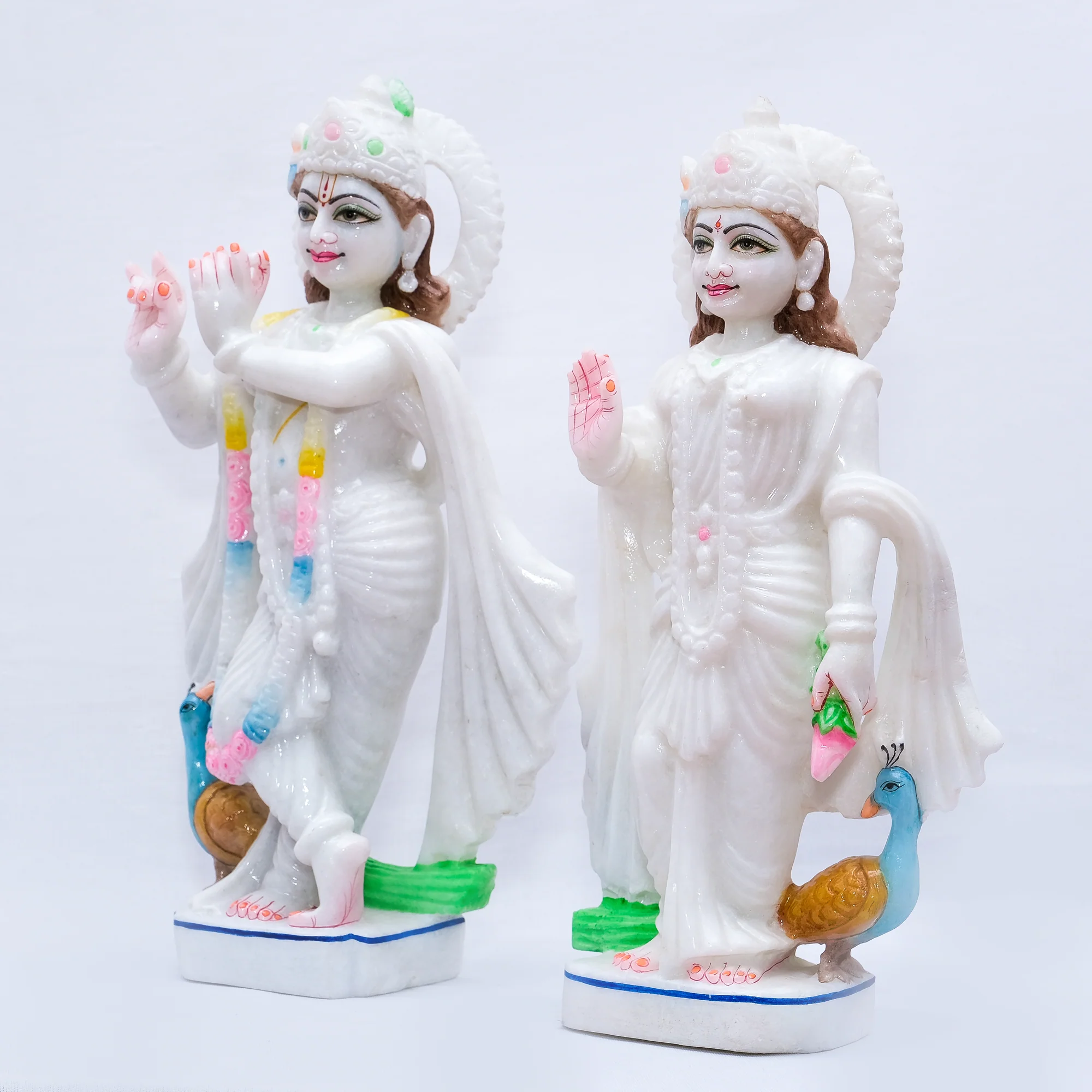 This elegant marble sculpture depicts Lord Krishna playing his flute, while Radha and a pair of peacocks stand nearby, enchanted by the divine melody. Symbolizing eternal love and devotion, Radha and Krishna are revered as the embodiment of pure, unconditional love. Devotees who worship this sacred pair are believed to be blessed with lasting love and spiritual harmony throughout their lives.