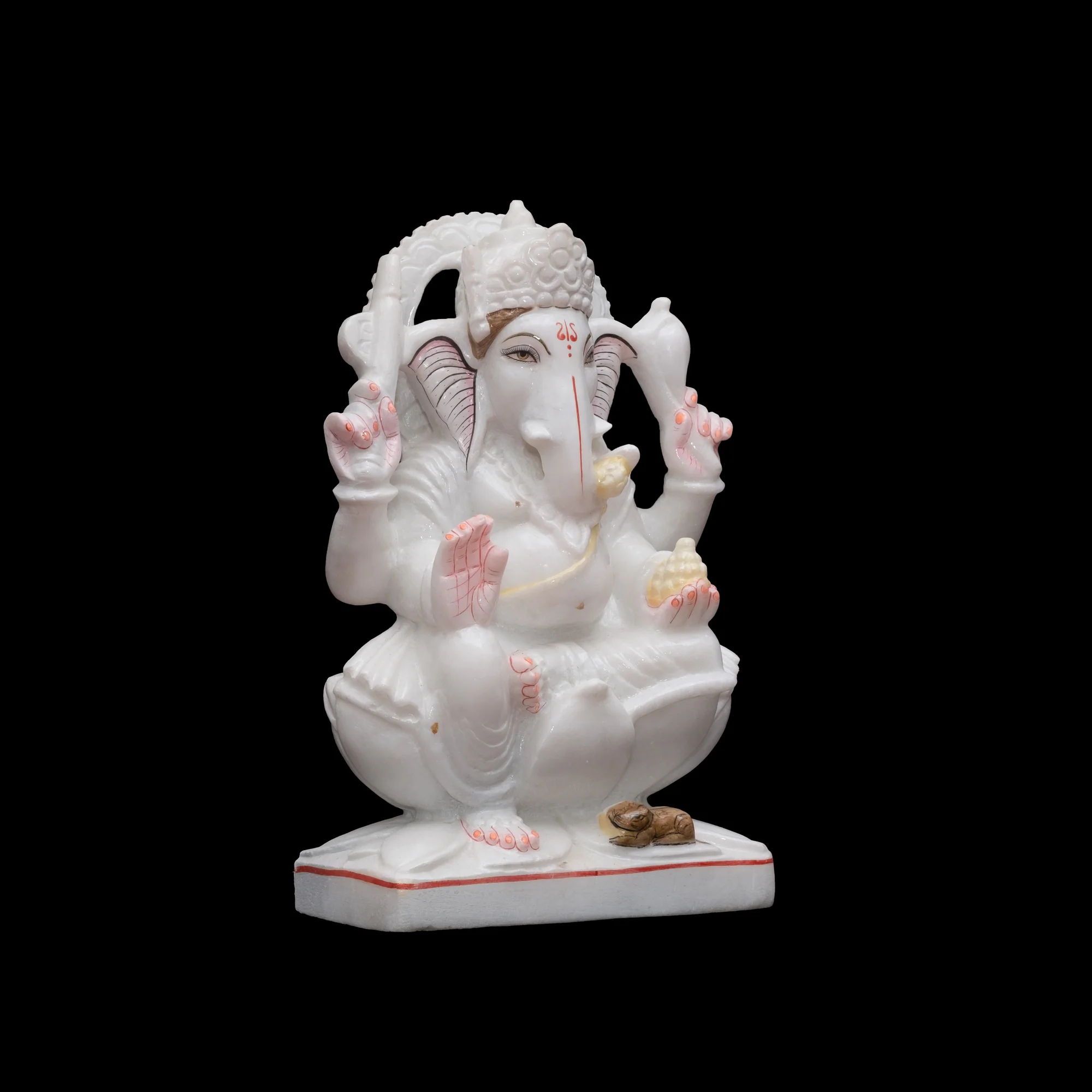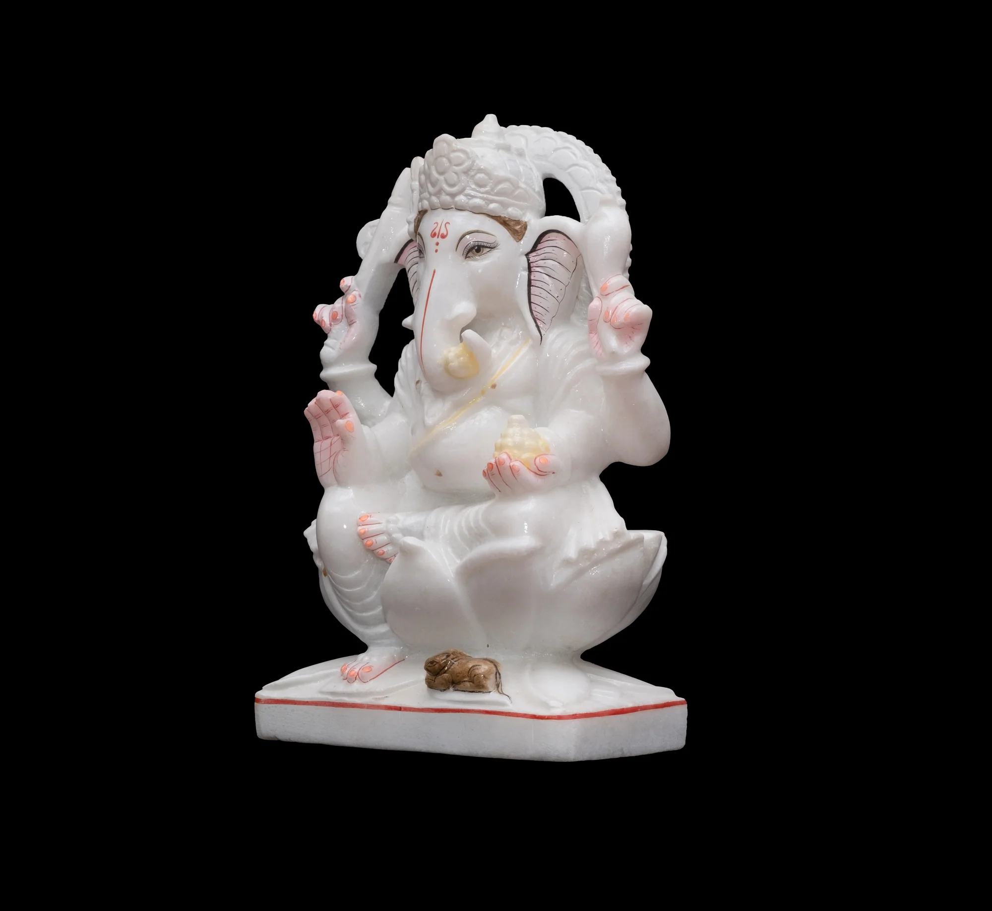 Lord Ganesh Ji, revered as Vighnaharta—the remover of obstacles and destroyer of evil—is a powerful symbol of protection and blessings. Placing his idol at your home or entrance is believed to ward off negative energies and invite prosperity, happiness, and peace. This beautifully crafted marble statue depicts Ganesh Ji holding a laddoo in his left hand, with his faithful vahan, the mouse, seated at his feet—signifying humility and devotion.