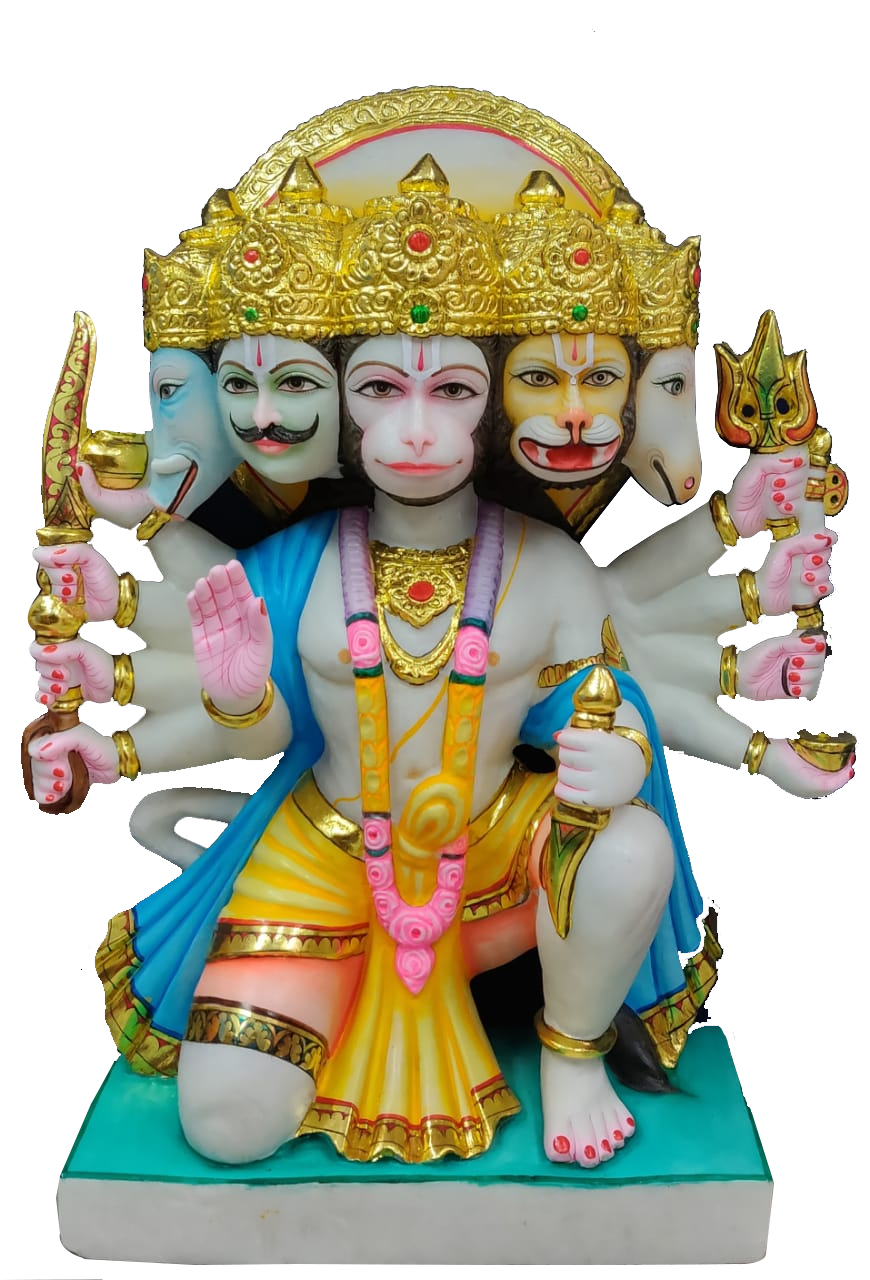 This intricately carved Panchmukhi Hanuman Ji statue is a divine representation of Lord Hanuman in his five-faced (Panchmukhi) form. Each face symbolizes a different deity and power: Hanuman (central), Narasimha, Garuda, Varaha, and Hayagriva. Made from high-quality marble and hand-painted in vibrant colors, the idol radiates spiritual energy, protection, and positivity. Ideal for temples, pooja rooms, and spiritual corners of your home or office, this piece is both a devotional symbol and a masterpiece of craftsmanship.