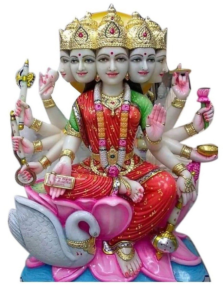 This stunning Gayatri Mata idol is finely carved from high-quality white marble and hand-painted with vibrant traditional colors. The five-faced form of the goddess, seated gracefully on a blooming lotus with a divine swan at her feet, symbolizes knowledge, purity, and divine energy. Each hand holds a symbolic item, representing wisdom, protection, and blessings , Ideal for home temples, religious ceremonies, or as a spiritual gift, this idol brings serenity and divinity into any space .