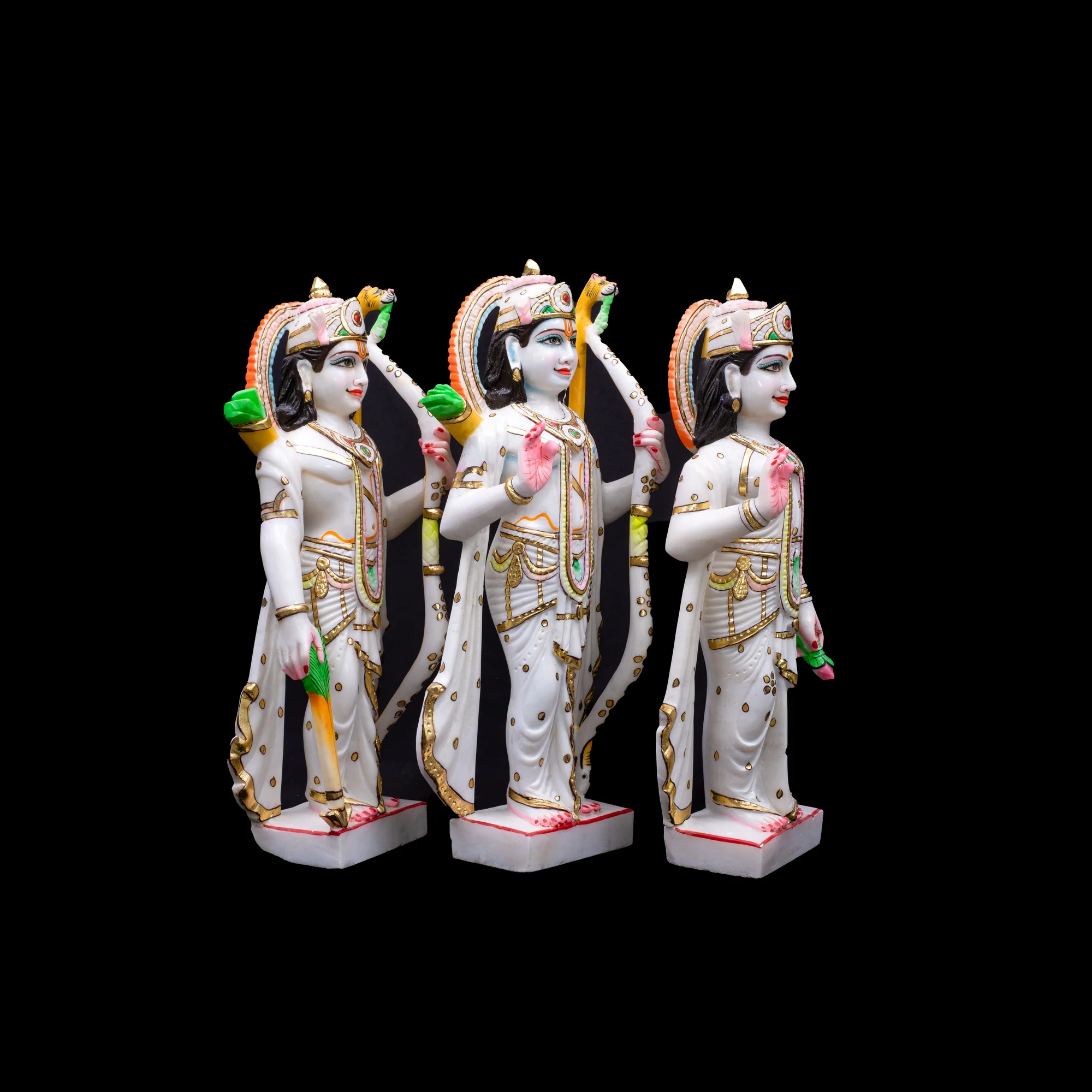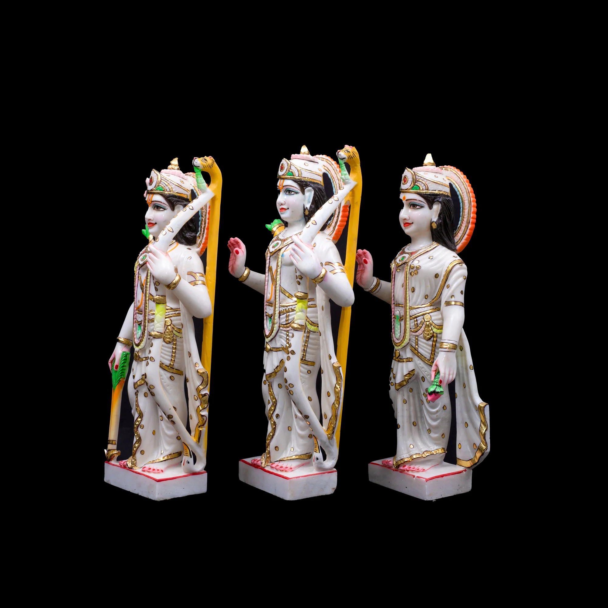 This finely crafted Ram Darbar statue, made from pure white marble, is beautifully hand-painted and adorned with intricate gold detailing. The set features Lord Ram, his consort Sita, and his brother Lakshman. Installing a Ram Darbar statue in your home temple is believed to invite peace, harmony, and prosperity into your life.