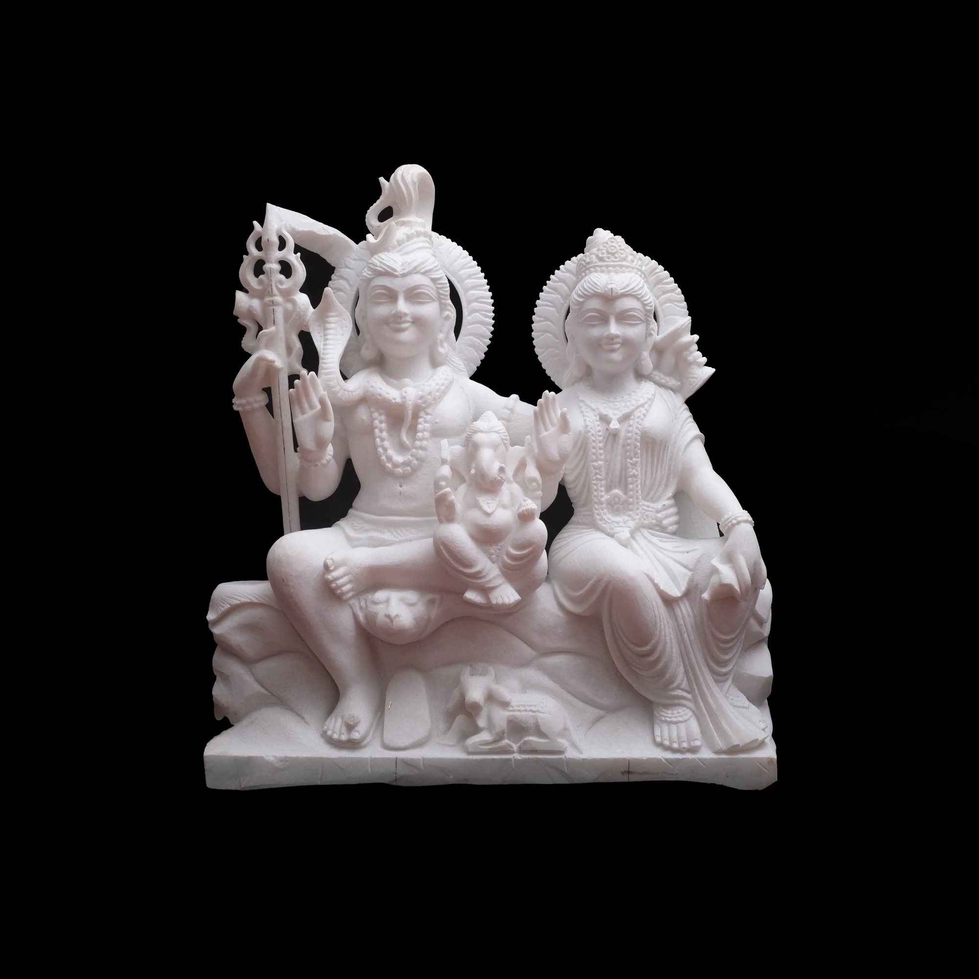 This Shiv Parivar statue is skillfully carved from premium white Makrana marble, sourced from the renowned quarries of Rajasthan. The divine ensemble features Lord Shiva alongside Goddess Parvati and Lord Ganesha, with Nandi seated faithfully at their feet
