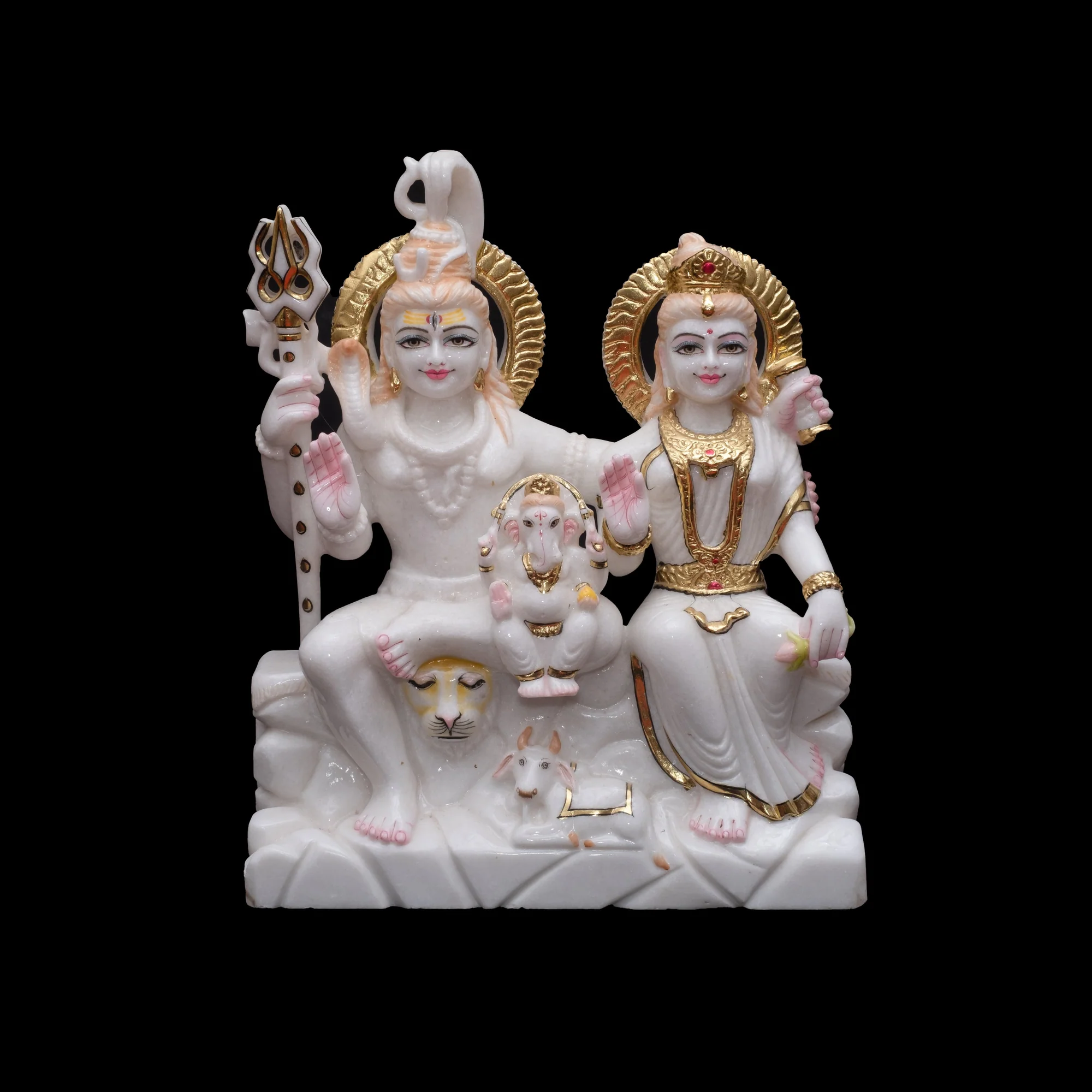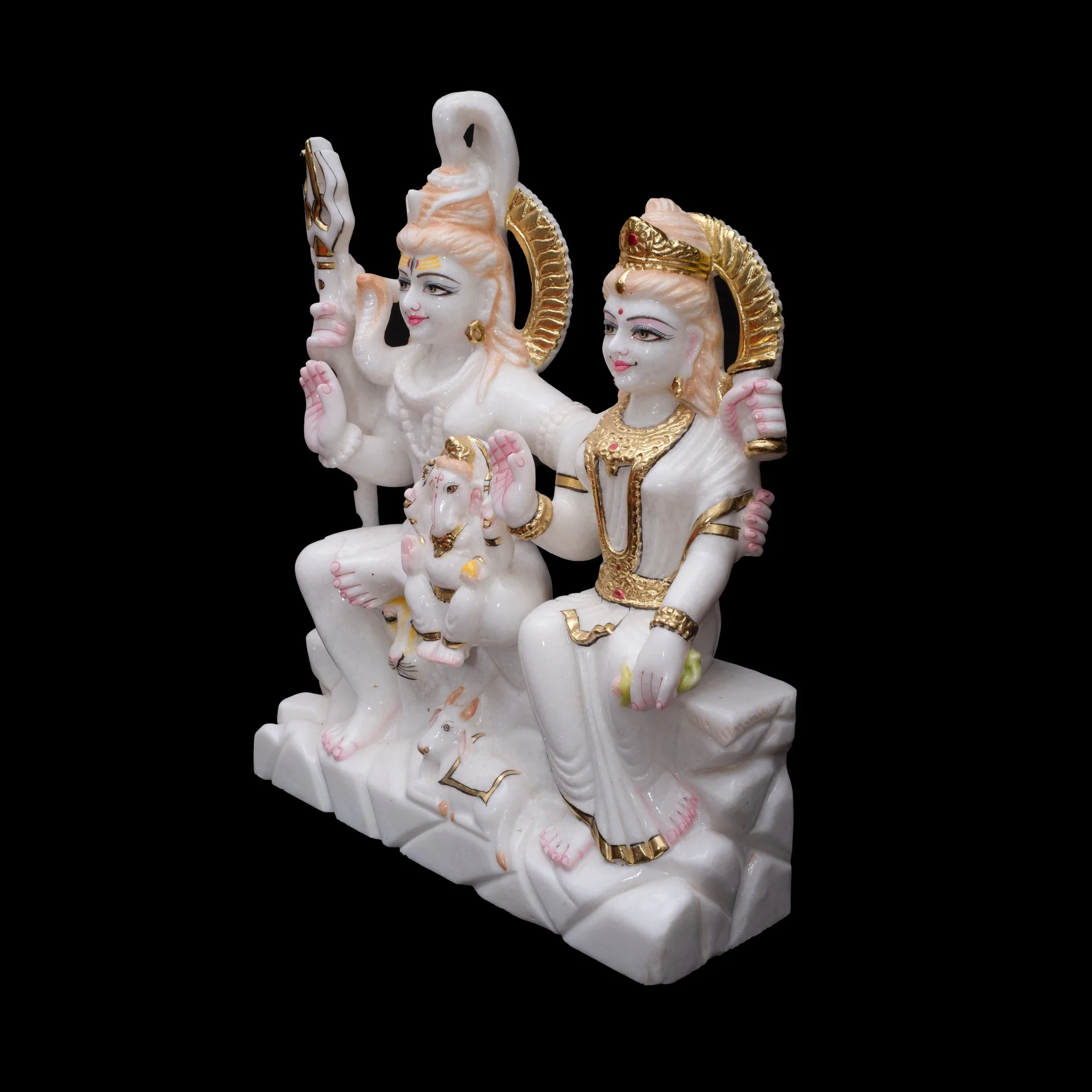 This Shiv Parivar statue is meticulously carved from pure white Makrana marble, sourced from the renowned quarries of Rajasthan. The sculpture beautifully depicts Lord Shiva alongside Goddess Parvati and Lord Ganesha, with Nandi seated reverently at their feet.
